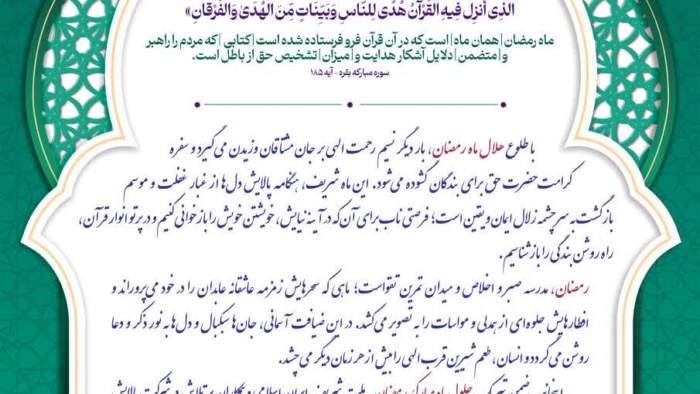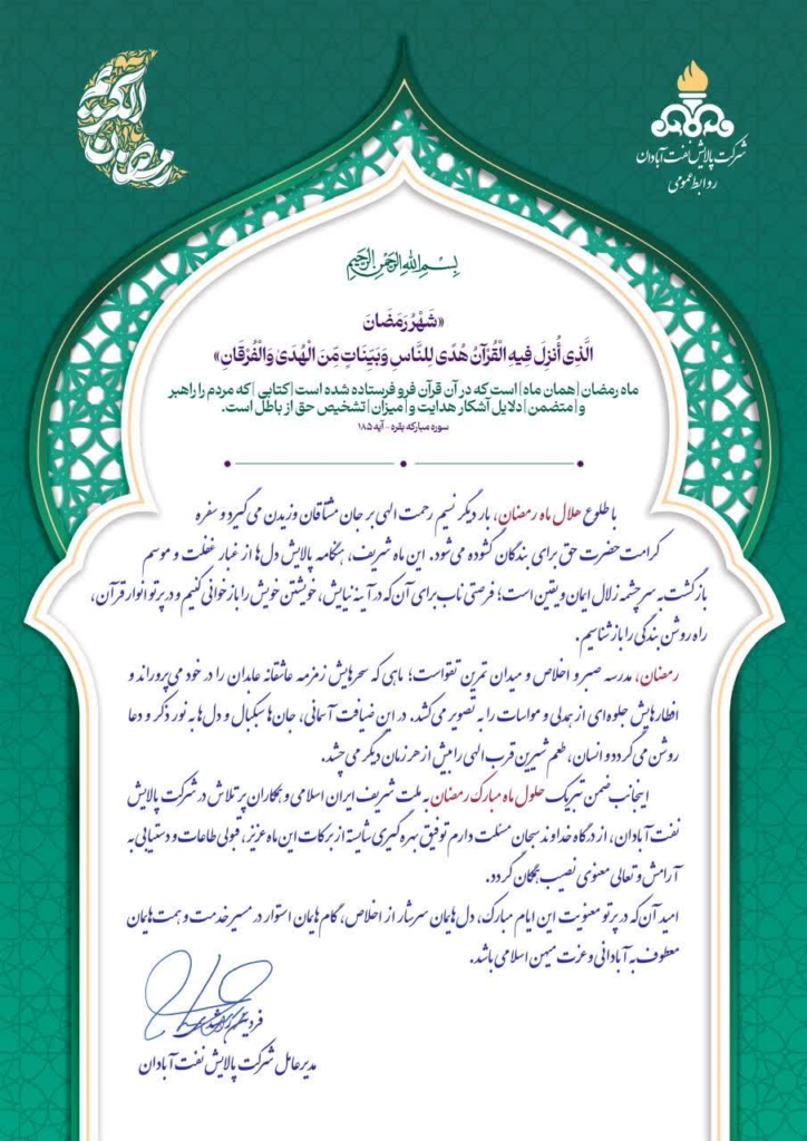 به گزارش اینجاخبر پیام مدیرعامل شرکت پالایش نفت آبادان به مناسبت فرا رسیدن ماه مبارک رمضان