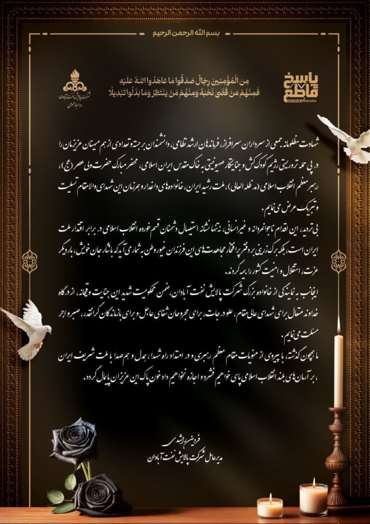 پیام تسلیت مدیرعامل شرکت پالایش نفت آبادان در پی جنایت رژیم صهیونیستی