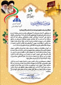 اینجانب صمیمانهترین مراتب تقدیر، سپاس و احترام خود را نسبت به تلاشهای شبانهروزی، ایثارگرانه و متعهدانه شما عزیزان اعلام میدارم و از درگاه خداوند متعال توفیق، عزت روزافزون و سلامت برای همه شما بزرگواران مسئلت دارم. امید آنکه در پرتو مجاهدتهای صادقانهتان، ایران اسلامی همواره سرافراز، مقتدر و مستقل باقی بماند و پاسدار صادق خون شهیدان این راه باشید.