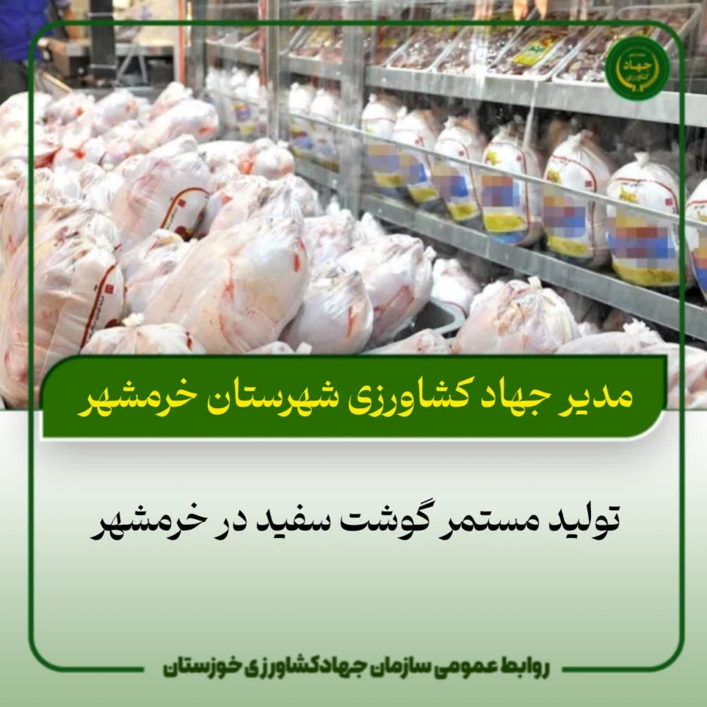 مدیر جهاد کشاورزی شهرستان خرمشهر از تولید ۴۶۸ تن گوشت سفید از ابتدای سال جاری تا کنون در این شهرستان خبر داد.