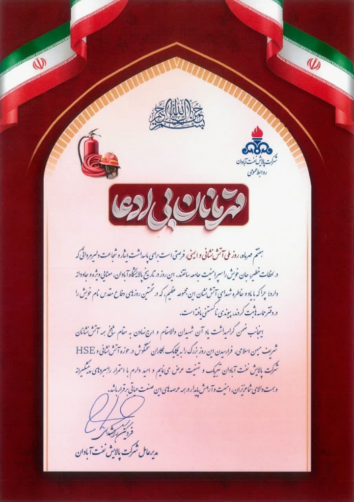 پیام مدیرعامل شرکت پالایش نفت آبادان به مناسبت فرا رسیدن روز ملی آتش‌نشانی و ایمنی