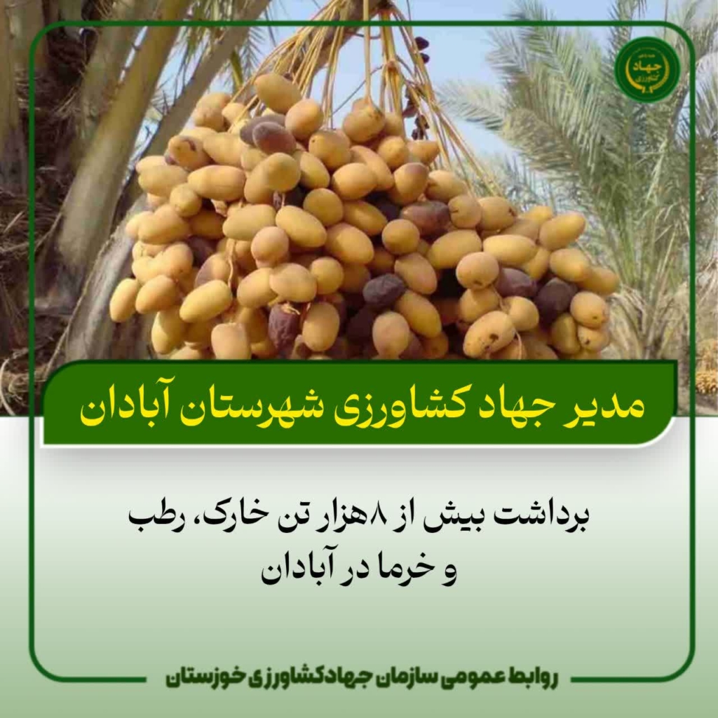 حسن دشتی نژاد افزود : شهرستان آبادان یکی از قطب های تولید خرما در استان خوزستان میباشد و دارای ارقام بسیار متنوع خرما ست که عمده آنها شامل استعمران،برحی بوده و ارقام بریم،زاهدی،کبکاب،لیلویی،خضراوی،اشگر،پیارم،بلیانی،سویدانی،بوبکی،بریم و … است.