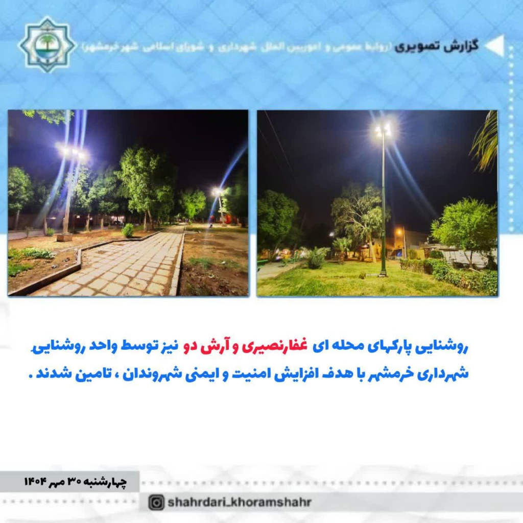 روشنایی پارکهای محله ای غفارنصیری و آرش دو نیز توسط واحد روشنایی شهرداری خرمشهر با هدف افزایش امنیت و ایمنی شهروندان ، تامین شدند