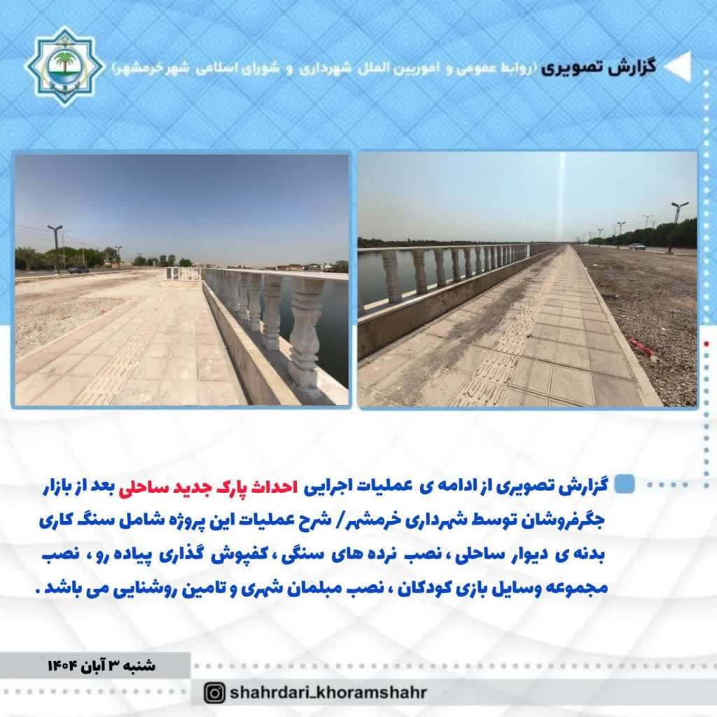 گزارش تصویری از ادامه ی عملیات اجرایی احداث پارک جدید ساحلی بعد از بازار جگرفروشان توسط شهرداری خرمشهر