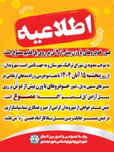 به موجب مصوبه ی شورای ترافیک شهرستان و به جهت تامین امنیت شهروندان ، از روز پنج شنبه ۱۵ آبان ۱۴۰۴ با نصب نیوجرسی و راه بندهای ارتفاعی در مسیرهای منتهی به پل ، عبور خودروهای با وزن بیش از دو تُن بر روی پل آزادی “پل قدیم” اکیداً ممنوع است . ضمن عذرخواهی از شهروندان گرامی از صبر و همکاری شما سپاسگزاریم . در ضمن مسیر جایگزین پل یادگار امام خمینی “ره” می باشد .