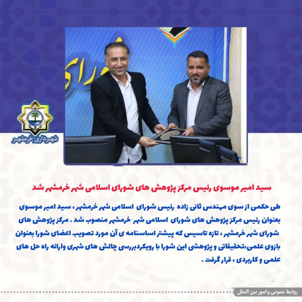 به گزارش اینجاخبر طی حکمی از سوی مهندس ثانی زاده رئیس شورای اسلامی شهر خرمشهر ، آقای سید امیر موسوی بعنوان رئیس مرکز پژوهش های شورای اسلامی شهر خرمشهر منصوب شد . مرکز پژوهش های شورای شهر خرمشهر ، تازه تاسیس که پیشتر اساسنامه ی آن مورد تصویب اعضای شورا بعنوان بازوی علمی ، تحقیقاتی و پژوهشی این شورا با رویکرد بررسی چالش های شهری و ارائه ی راه حل های علمی و کاربردی ، قرار گرفت .