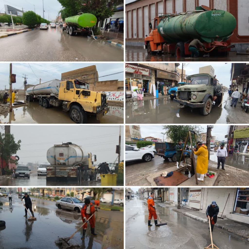 گزارش تصویری از بخش از تلاش های مستمر و بدون وقفه ی نیروهای خدمات شهری شهرداری خرمشهر جهت دفع آبهای سطحی ناشی از بارندگی در نقاط مختلف سطح شهر با هدف تسهیل در تردد شهروندان