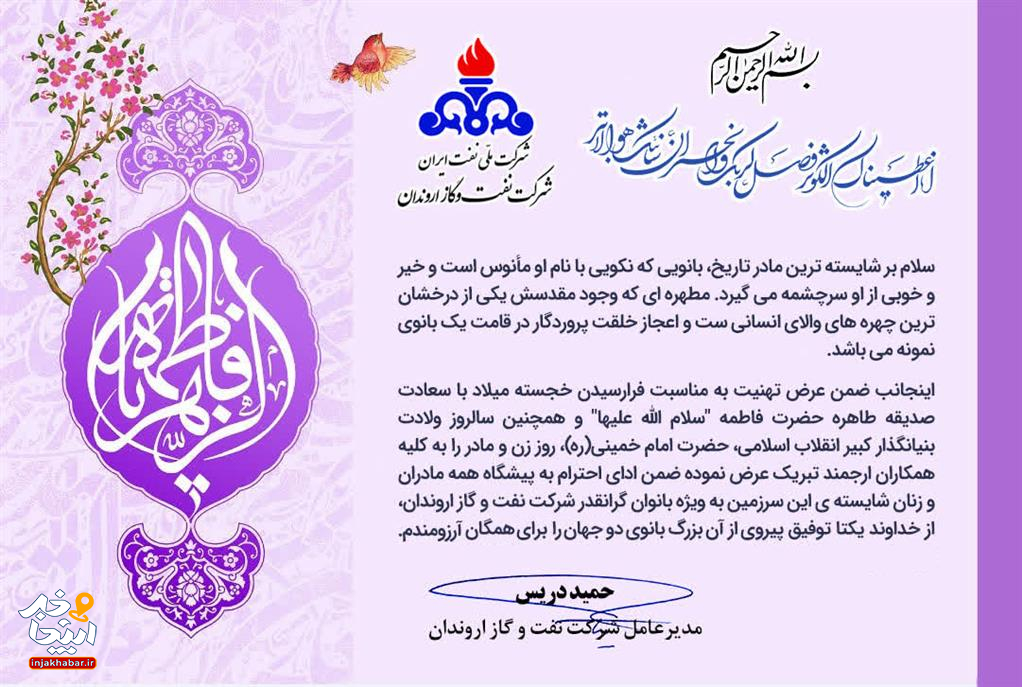 اینجانب ضمن عرض تهنیت به مناسبت فرارسیدن خجسته میلاد با سعادت صدیقه طاهره حضرت فاطمه “سلام الله علیها” و همچنین سالروز ولادت بنیانگذار کبیر انقلاب اسلامی، حضرت امام خمینی(ره)، روز زن و مادر را به کلیه همکاران ارجمند تبریک عرض نموده ضمن ادای احترام به پیشگاه همه مادران و زنان شایسته ی این سرزمین به ویژه بانوان گرانقدر شرکت نفت و گاز اروندان، از خداوند یکتا توفیق پیروی از آن بزرگ بانوی دو جهان را برای همگان آرزومندم.