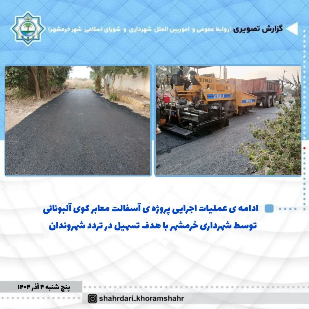 گزارش تصویری از ادامه ی عملیات اجرایی پروژه ی آسفالت معابر کوی آلبونائی توسط شهرداری خرمشهر با هدف تسهیل در تردد شهروندان