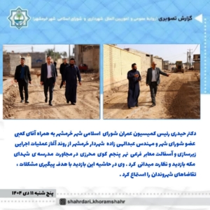 از روند آغاز عملیات اجرایی زیرسازی و آسفالت معابر فرعی نهر پنجم کوی محرزی در مجاورت مدرسه ی شهدای مکه بازدید و نظارت میدانی کرد .